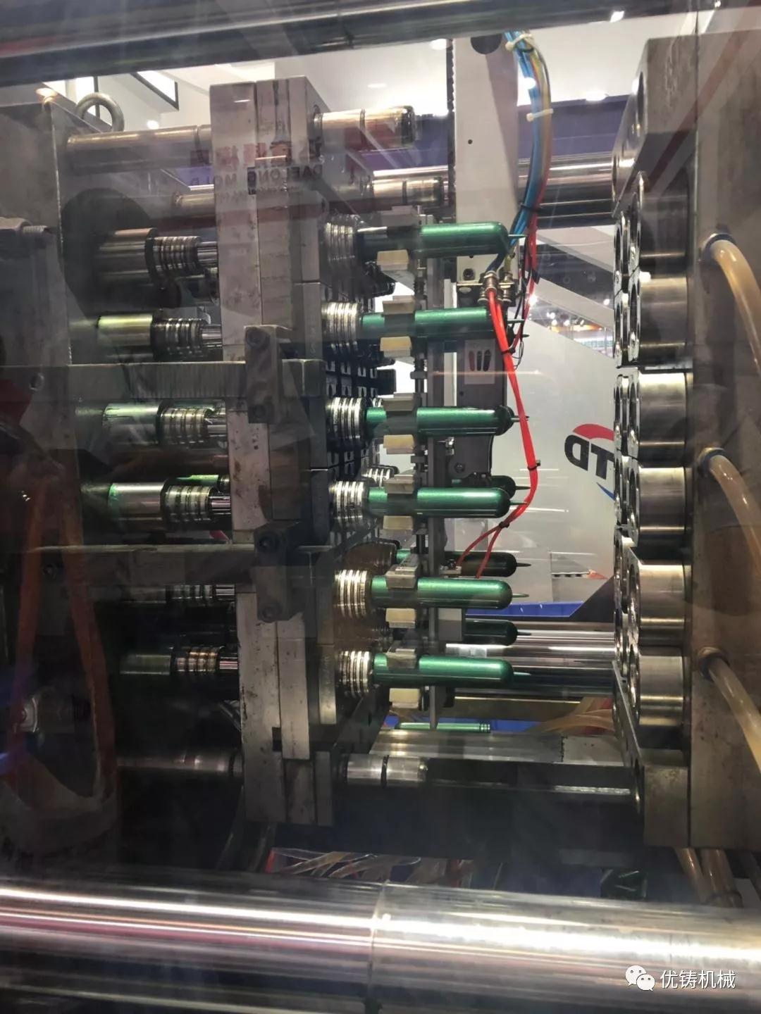 現(xiàn)場展示生產(chǎn)PET化妝品瓶胚,搭配中央供料系統(tǒng)、機械手取出,全套自動化集成系統(tǒng),制品1出12每模768克,PET加閃光綠色母高混煉要求之下,每模34秒周期時間,只需要3bar低背壓,塑化質(zhì)量令眾多觀眾駐足觀看,所為內(nèi)行看門道,不少觀眾提出要拿制品回去研究,看來Chinaplas展會專業(yè)觀眾不少啊,值得點贊!