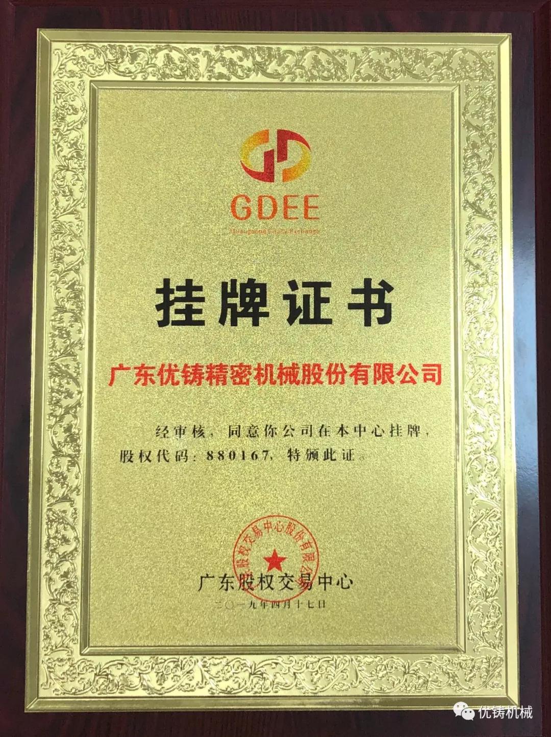 廣東優(yōu)鑄精密機械股份有限公司代表于掛牌頒授儀式(董事長洪浩坤先生)
