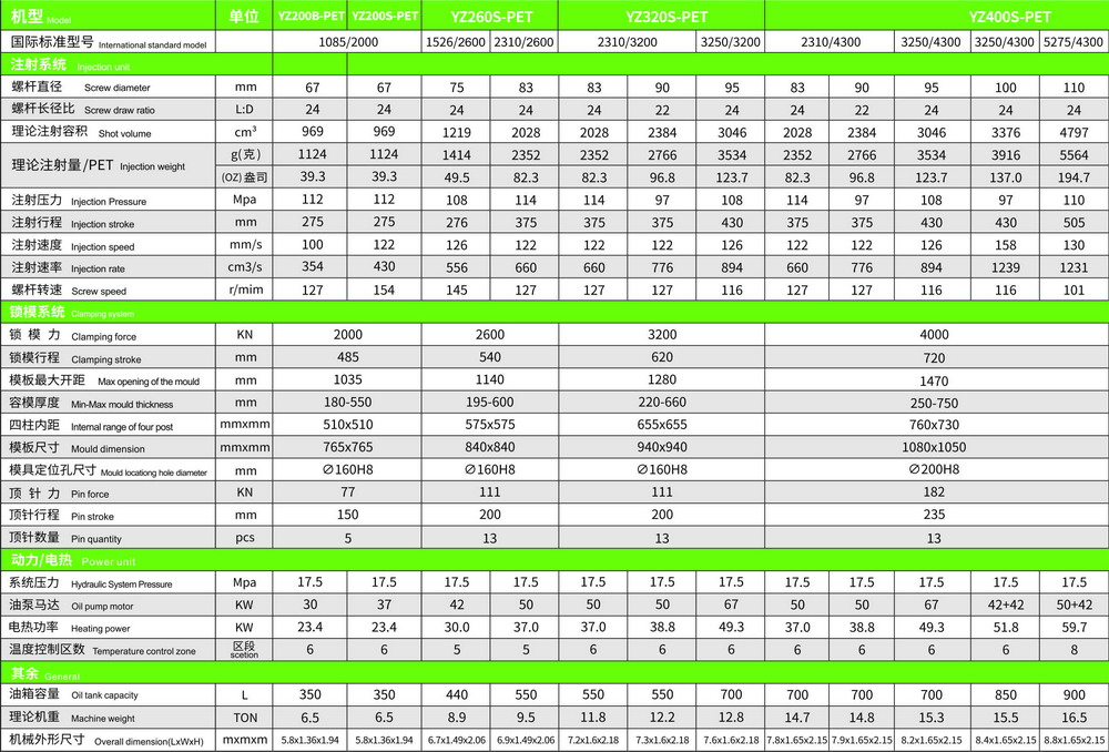PET機(jī)型參數(shù)表(適用于飲料瓶、油瓶)
